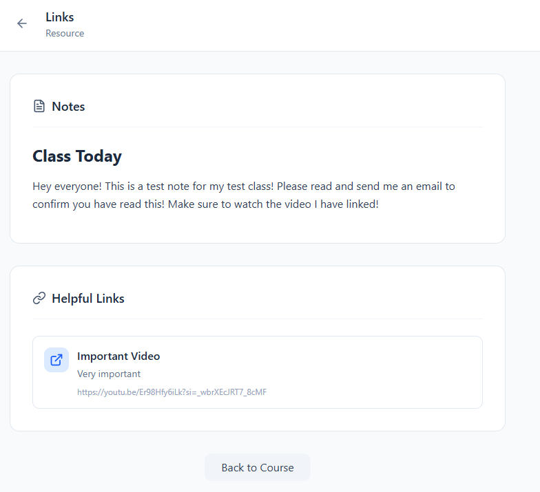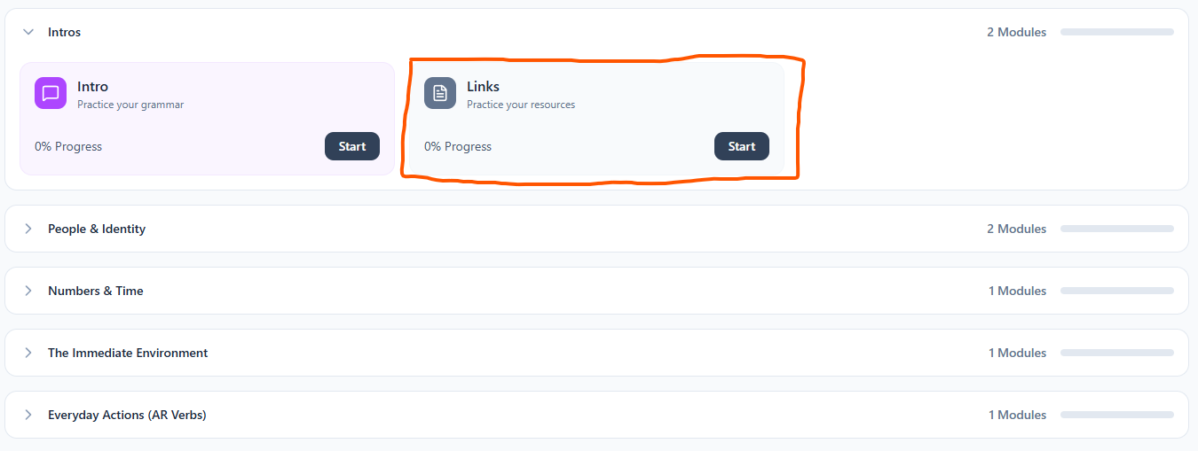 Resources are a quick way for instructors to provide information to you within German Lingo. Instructors have the option to give you text and links within each chapter module.